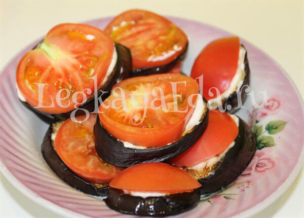 Баклажаны жареные с чесноком, майонезом и помидорами